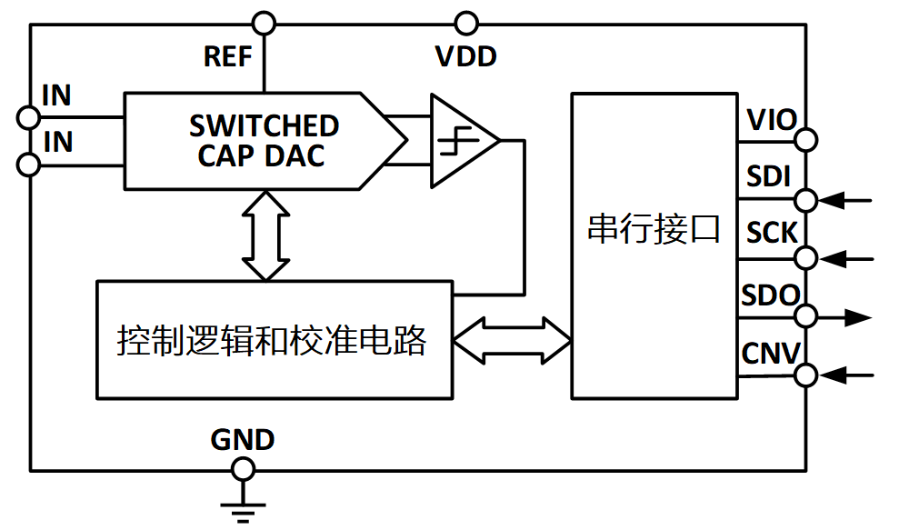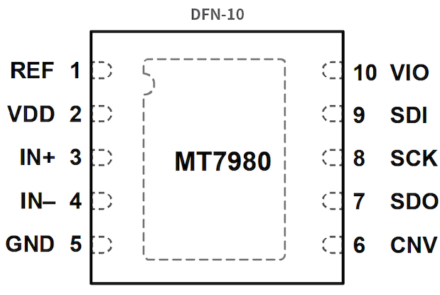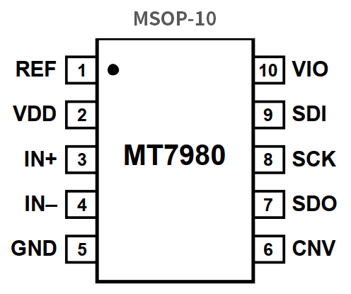 MT7980是一款16位、逐次逼近型模數轉換器(ADC),采用單電源(VDD)供電。它內置一個低功耗、高速、16位采樣ADC和一個多功能串行接口端口。在CNV上升沿,該器件對IN+與IN- (IN-為信號的參考地) 之間的模擬輸入電壓差進行采樣,范圍從0至REF?;鶞孰妷?REF)由外部提供,并且可以獨立于電源電壓(VDD)。