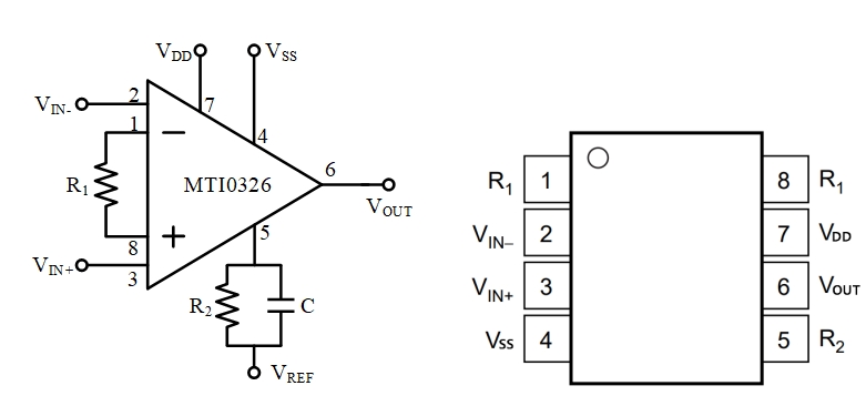 MTI0326是一款低失調(diào)軌到軌儀表放大器,其采用新穎獨特的內(nèi)部電路拓撲結(jié)構(gòu),實現(xiàn)了出色的精度,易調(diào)節(jié)增益的結(jié)構(gòu)和小尺寸也使其成為各種儀表應(yīng)用的理想選擇。MTI0326可以廣泛用于工業(yè)控制、數(shù)據(jù)采集系統(tǒng)、電流檢測、鋰電池化成分容、傳感器信號調(diào)理、電壓衰減器等諸多應(yīng)用場合。芯片引腳定義如圖1所示,雖與傳統(tǒng)儀表運放結(jié)構(gòu)有所區(qū)別,但引腳基本兼容常規(guī)引腳定義,客戶可在已有解決方案中實現(xiàn)快速替換。封裝方式為塑封MSOP8和SOP8。